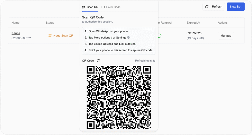 Hubungkan akun Whatsapp yang ingin dijadikan sebagai virtual agent dengan cara Scan QR Code melalui aplikasi Whatsapp